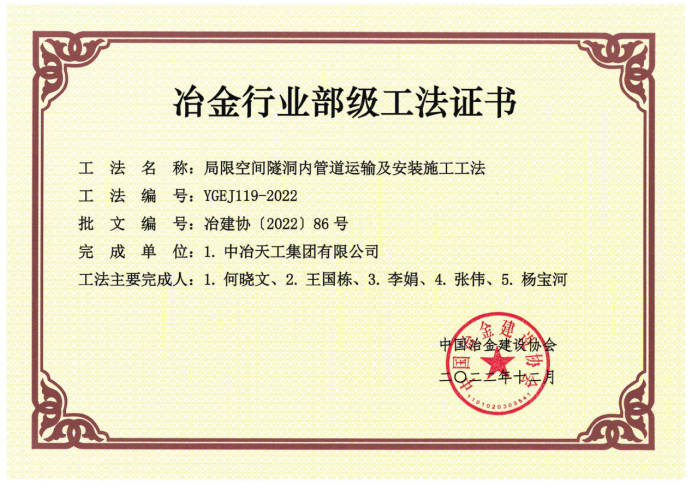 1月12日,北方公司《局限空間隧洞內管道運輸及安裝施工工法》榮獲冶金行業部級工法證書。
