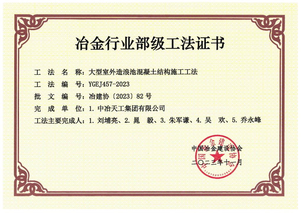 獲評工法《大型室外造浪池混凝土結構施工工法》借助公司滄州文化旅游城項目實施過程而總結提煉形成一種大型室外造浪池混凝土結構施工技術,解決了施工過程中異形結構模架支設困難、大體積混凝土水化熱釋放不完全、多層大底板內預埋給水管上浮、大底板弧形表面標高控制誤差過大等難題;工法《高層建筑大坡屋面施工工法》以滄州濱海童世界項目為依托,通過優化項目大坡屋面施工措施方案,設計便捷的施工操作平臺,不僅提高坡屋面的施工效率,降低成本,更有效保障施工人員的安全。
