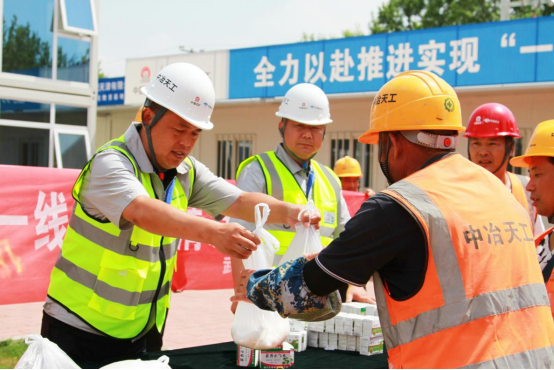 活動中,項目負責人帶領管理人員向廣大作業人員發放礦泉水、西瓜、綠豆、白糖以及防暑降溫藥品等慰問品,為奮戰施工一線的工友們送去關懷和問候,感謝大家長期以來的堅守和辛勤付出,并叮囑大家要進一步強化安全生產意識,繃緊安全責任弦,扎實做好防暑降溫、安全生產、質量管控等各項工作。