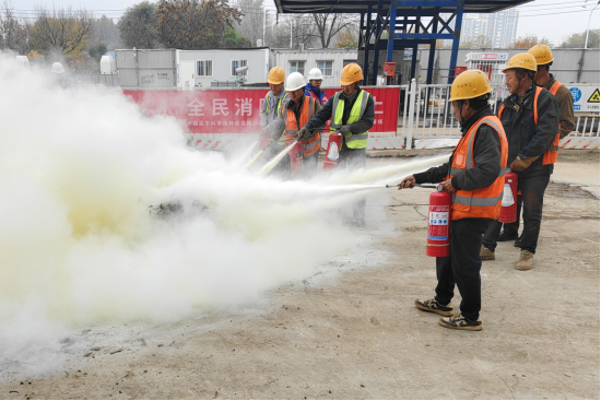 隨后,項目部組織開展消防安全應急演練。演練開始前,項目安全負責人詳細講解了火災應急疏散演練方案,并現場演示了如何正確使用滅火器撲滅初期火災,演練過程中,全體參演人員迅速進入狀態,有條不紊推進各項工作,上報火情、撥打救援電話、現場警戒、緊急集合、疏散人員、現場滅火,各環節緊密銜接、一氣呵成,充分檢驗了項目消防應急預案的實操性,達到了預期效果。