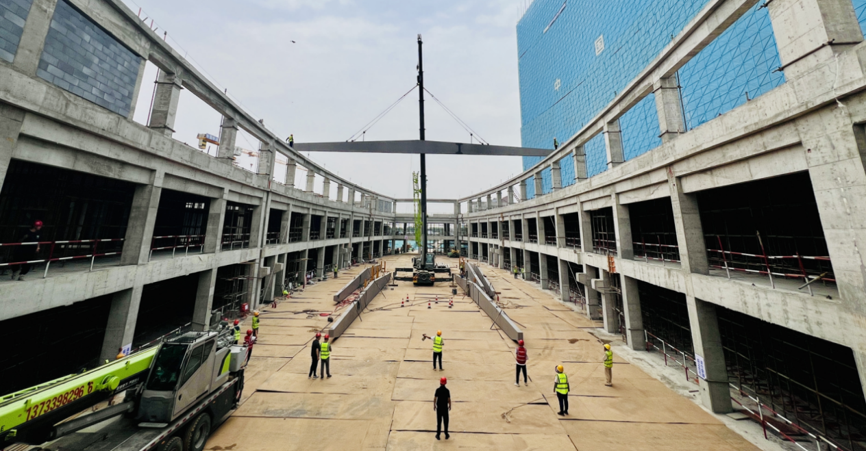 漯河市養老產業綜合服務園建設項目康復醫院中庭采光頂總安裝面積2819.92萬平方米,鋼結構屋頂總重量323噸,主體采用“主次梁+單層方管”結構形式,具有抗震性能優、跨度大、環保節能等特點。本次首榀梁的成功吊裝,標志著項目突破重大施工節點,后續將采用大梁單根吊裝和次構件散裝相結合的吊裝形式,預計于2025年7月底完成全部鋼結構施工。