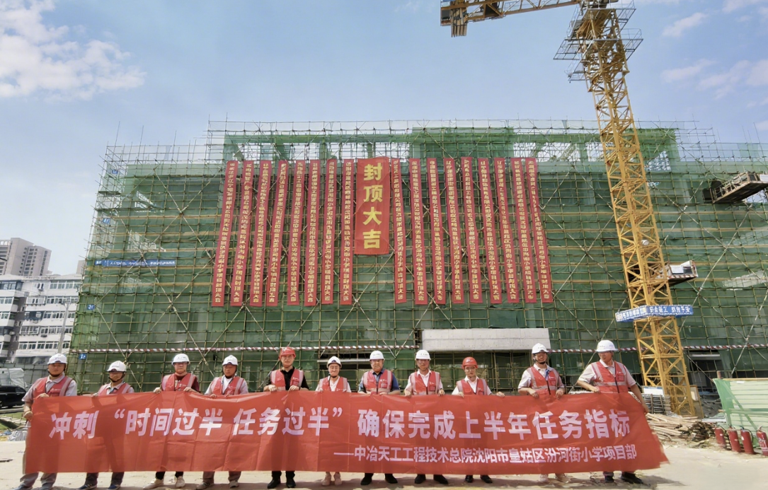 6月25日,工程技術總院承建的沈陽市皇姑區汾河街小學新建教學樓工程EPC總承包項目教學樓主體結構全面封頂,標志著項目建設取得關鍵性進展,將全面進入二次結構及裝飾裝修階段。沈陽市教育局、皇姑區教育局、城建局、教育事務服務中心等相關領導以及居民、家長、教師、業主代表和項目部全體人員近50人共同參加了封頂儀式。