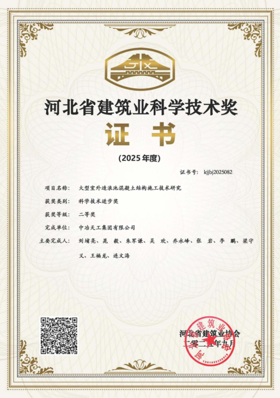 近日,從河北省建筑業協會官網獲悉,開物工程公司《大型室外造浪池混凝土結構施工技術研究》成果獲2025年度河北省建筑業協會科學技術進步獎二等獎。